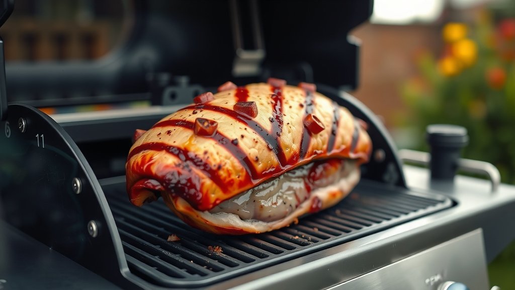 To prevent a dry ham, maintain a lower grill temperature (around 250°F), cover the ham loosely with foil for most of the cooking, especially if it’s spiral-sliced. You can also spritz the ham periodically with apple juice or broth to add moisture.